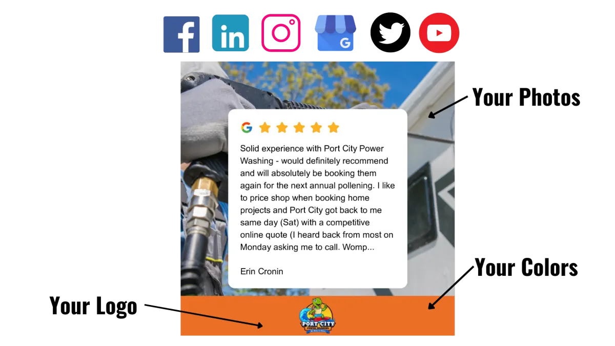 Limited Time Bonus: We'll create & post social media content with your branding every time you get a five star review! This allows your customers reviews to do the selling for you!